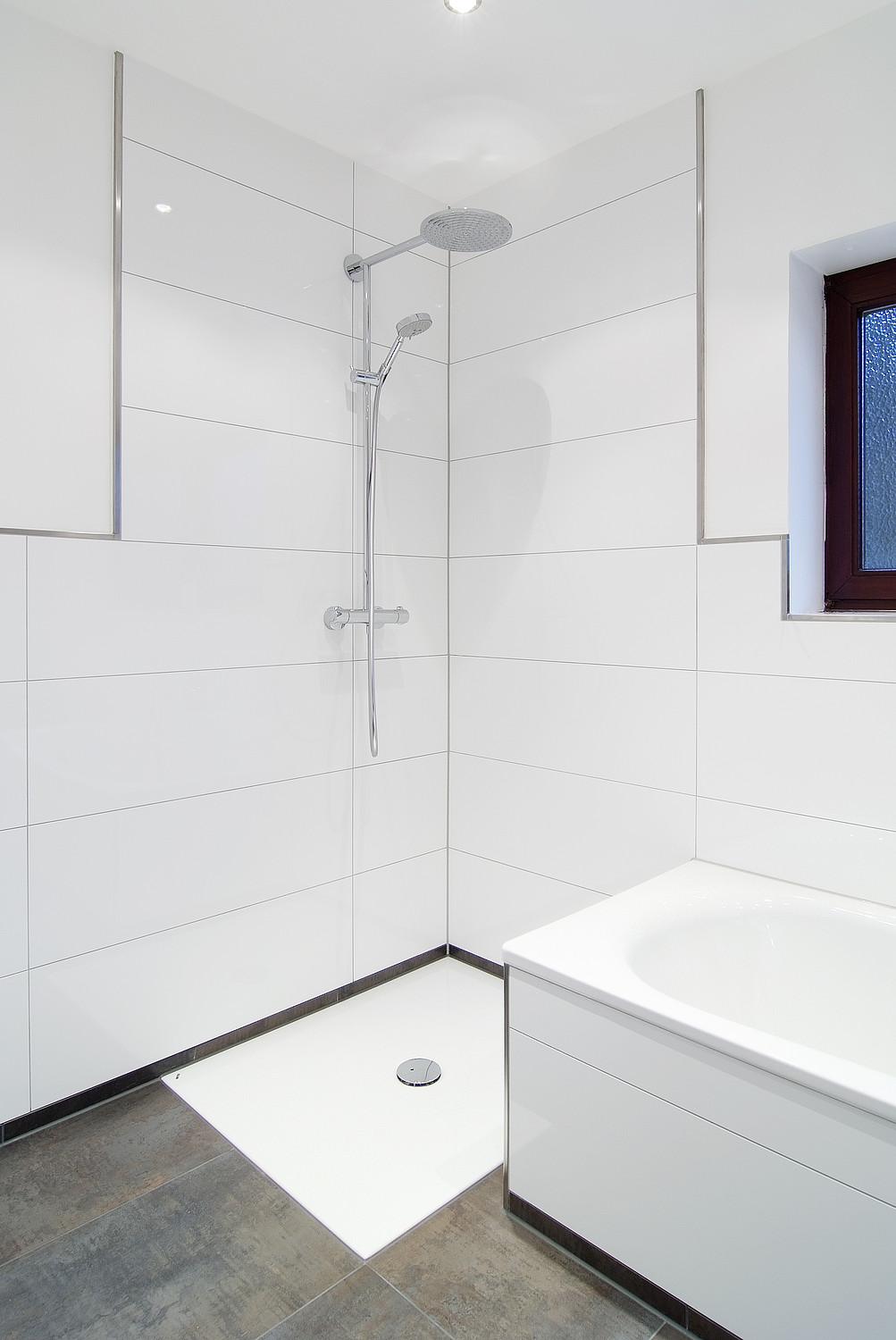 Eine bodengleiche Duschtasse (die Glastüren waren beim Fototermin noch nicht eingebaut) ist einfach super-bequem. Vornehm sind die Abschlussleisten aus Edelstahl an den Wandfliesen. Dunkles Holz, weiße Fliesen, klare Lichtpunkte. Der edle Farbton der dunklen Holzmöbel findet sich auch in den changierenden Bodenfliesen wieder. Abgesetzt über eine schwarze Sockelleiste strahlen die reinweißen Wandfliesen und Sanitärobjekte Frische aus. Für die passende Beleuchtung zu jeder Gelegenheit sorgen Spots in der Decke und die Strahler über den Spiegeln. Das große Doppelwaschbecken mit Ablageflächen rechts und links gibt dem Badezimmer Größe und Eleganz.